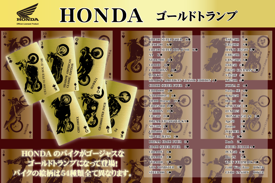 『HONDA』より、歴代二輪車のシルエットを印刷したトランプがプライズに登場!