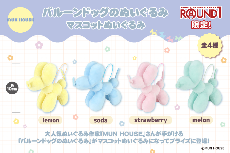 大人気ぬいぐるみ作家「MUN HOUSE」の手がける『バルーンドッグのぬいぐるみ』が約10cmのマスコットぬいぐるみになってROUND1限定プライズで登場!
