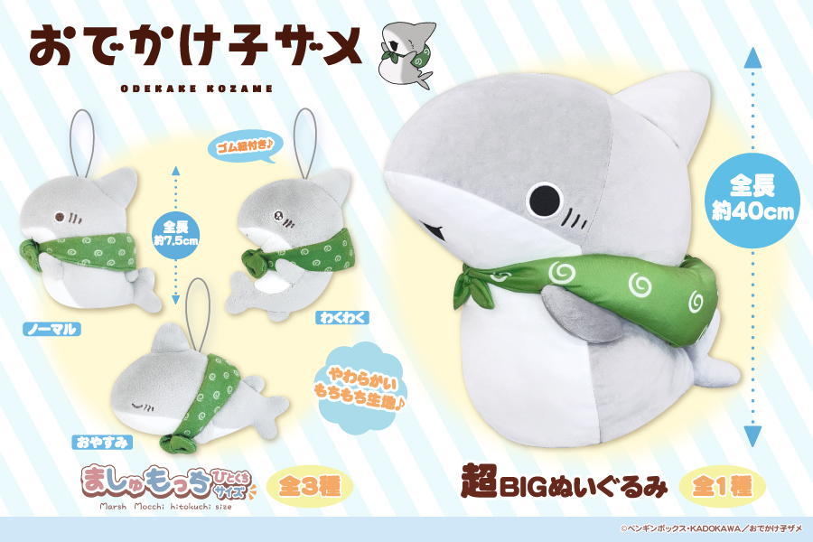 大人気作品『おでかけ子ザメ』のましゅもっちひとくちサイズ&超BIGぬいぐるみがプライズで登場です!