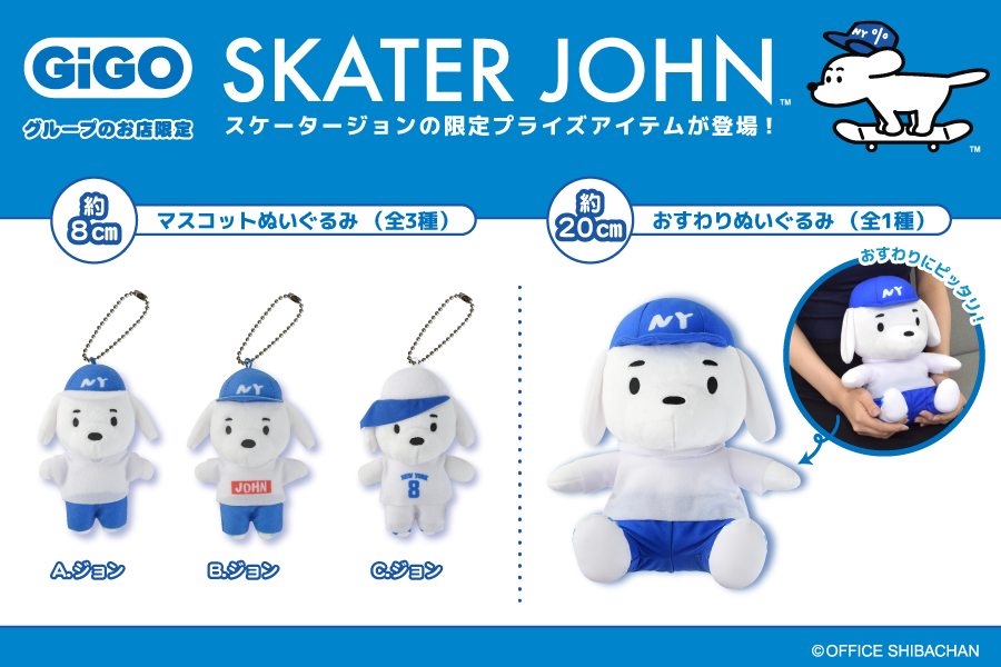 『SKATER JOHN』のマスコットぬいぐるみとおすわりぬいぐるみが