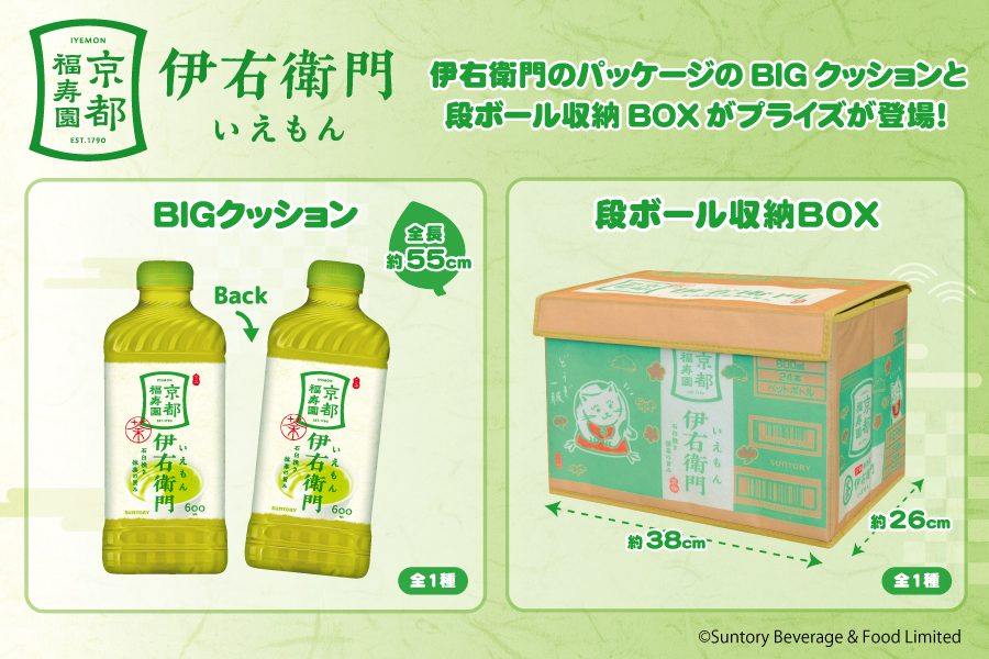 大人気『伊右衛門』のパッケージそのままの BIGクッション、便利な段ボール収納BOXが登場です!