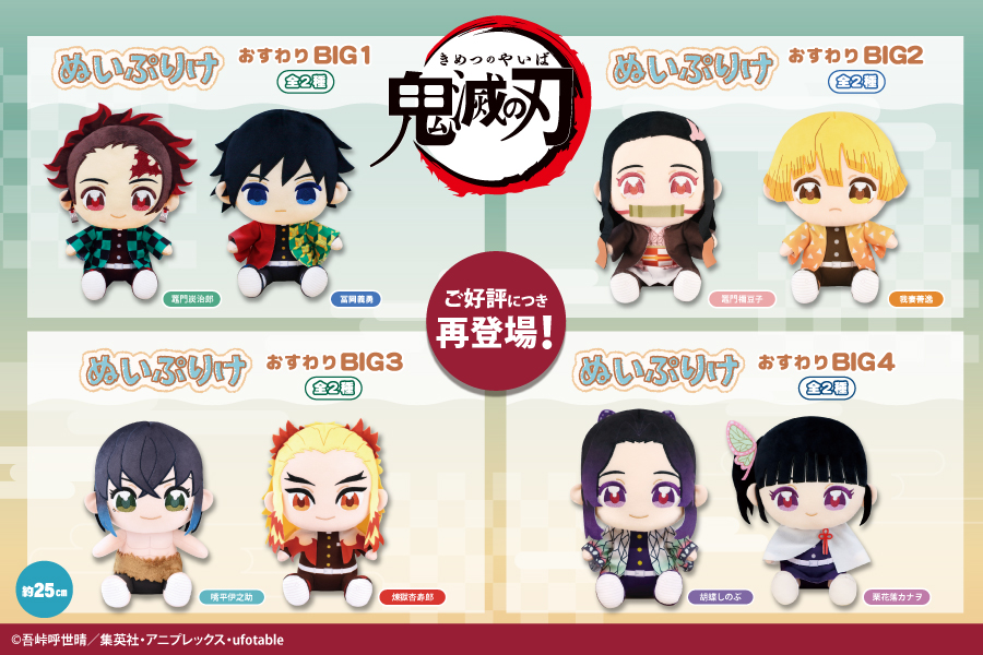 アニメ「鬼滅の刃」の、ぬいぷりけおすわりBIG1~4がプライズに再登場!