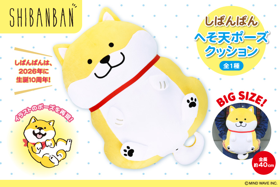 SNSやLINEクリエイターズスタンプで大人気『しばんばん』の 「へそ天ポーズクッション」がプライズで登場!